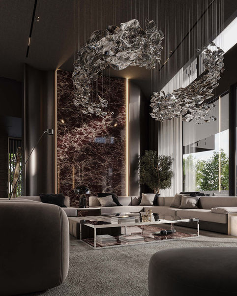 Floor-to-ceiling windows bring natural light deep into the interiors, enhancing the relationship between inside and outside. Fior di Bosco marble, Rosso Lepanto stone, bronze-toned details, and ash oak wood veneer create a material palette that balances depth, warmth, and refinement.