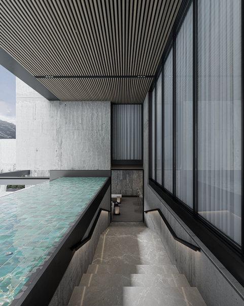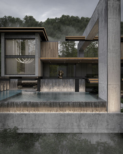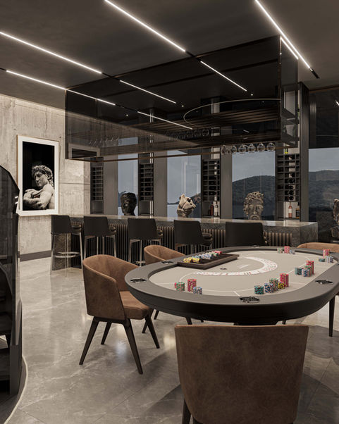 A distinctive feature of the project is the garage and man cave, connected across two levels to create a layered spatial experience. The result is a residence shaped by topography, materiality, and a strong architectural presence.