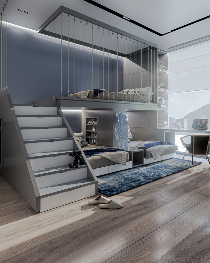 Engineered woods, exposed beams, and polished concrete define a material palette of permanence and refined simplicity, while the architecture prioritizes fluidity and flexibility across the home.