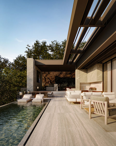 El diseño interior utiliza una paleta de colores arena, acentos en tonos terracota y acabados en madera de roble, creando un ambiente cálido y sofisticado. Las áreas verdes, presentes en el interior y el exterior, agregan un toque natural y decorativo, mientras que la terraza con asador y sala exterior invita a la convivencia en un entorno relajado.