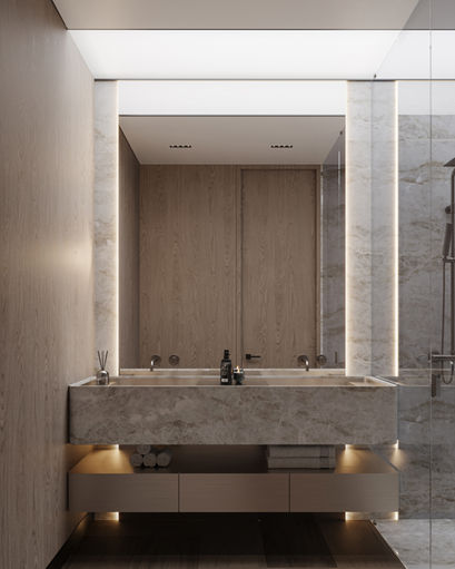 La cocina es un ejemplo perfecto de esta fusión entre funcionalidad y elegancia. La isla de mármol rojo y la cubierta de la mesa del mismo material además de ser un elemento práctico se convierte en un punto focal llamativo que aporta un toque dinámico al espacio. Este uso magistral del mármol rojo se repite en el baño de huéspedes y el baño principal, convirtiéndose en un elemento clave de la identidad del proyecto.