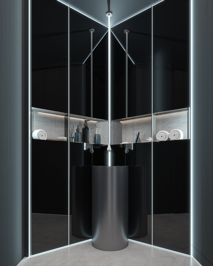 La iluminación led es implementada de forma sutil, a través de aplicaciones en paredes, candiles y mobiliario que conectan con la estética moderna del proyecto. Esta mezcla de iluminación, materiales y texturas llega a la selección de alfombras, seleccionada en tonalidades frías que hagan contraste con el mobiliario.