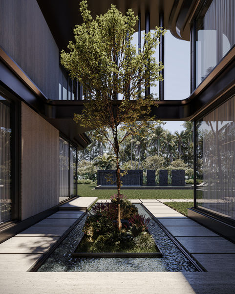 Located in a exclusive villa, this residence redefines Miami’s lifestyle by blending the serenity of Zen philosophy with the vibrancy of one of the world's most dynamic metropolises. The project consists of two levels with six bedrooms, ten bathrooms and specialized spaces such as a cinema, spa and gym. A central courtyard with water mirrors, a pool with a weeping wall and an enveloping waterfall reinforce the connection with the surroundings. The horizontal façade, with tubular latticework and play of light, complements the atmosphere of calm and sophistication.