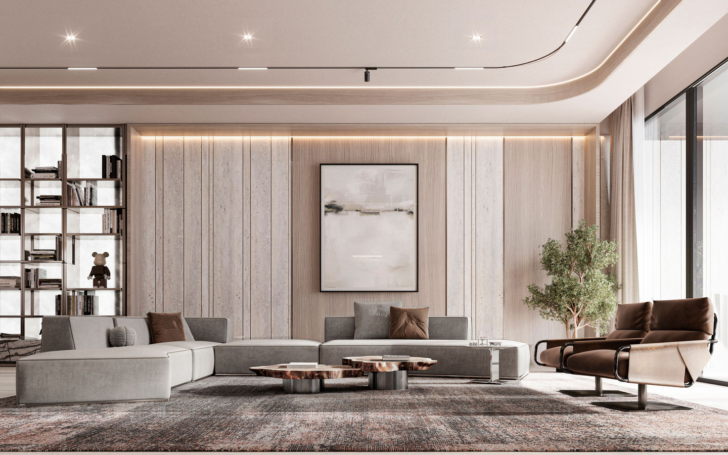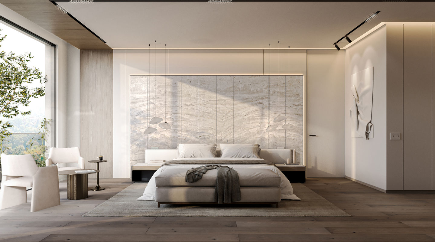 The first level brings together social areas and bedrooms through a refined palette of wood and travertine inspired tech stone, creating an atmosphere that feels both welcoming and sophisticated. Lighting and carefully selected furnishings add contrast while reinforcing the sense of openness.
