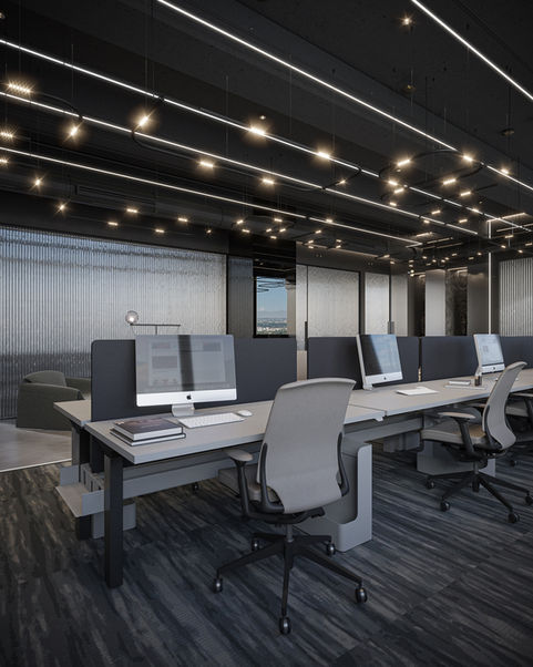 Private offices and meeting rooms are organized to support flexibility and daily productivity, while corrugated glass introduces depth, light, and visual rhythm throughout the space. Natural stone, integrated LED lighting, and carefully varied ceiling treatments reinforce the project’s modern identity.